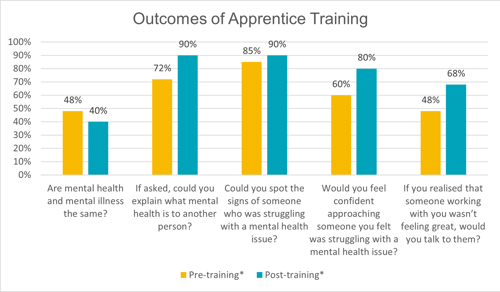 In order to deliver an effective programme for this historically hard-to-reach group, we surveyed a group of apprentices from across the UK about mental health both before and after the delivery of a pilot apprentices training course around the topic. The course had an overwhelmingly positive response from both the employers who facilitated our delivery and the apprentices who participated – and the results showed a significant improvement in a number of the measures of understanding and confidence around the topic: